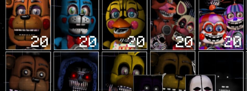 Featuring 50 selectable animatronic characters spanning seven five nights at freddy s games the options for customization are nearly endless. A 500 character roster with characters from all over the fnaf franchise including the main series of games spin offs merchandise the fanverse initiative and many more each character able to be customized in ai difficulty between 0 and 20 there is nearly endless possibilities for your own custom nights. 15 different challenges to choose from.
